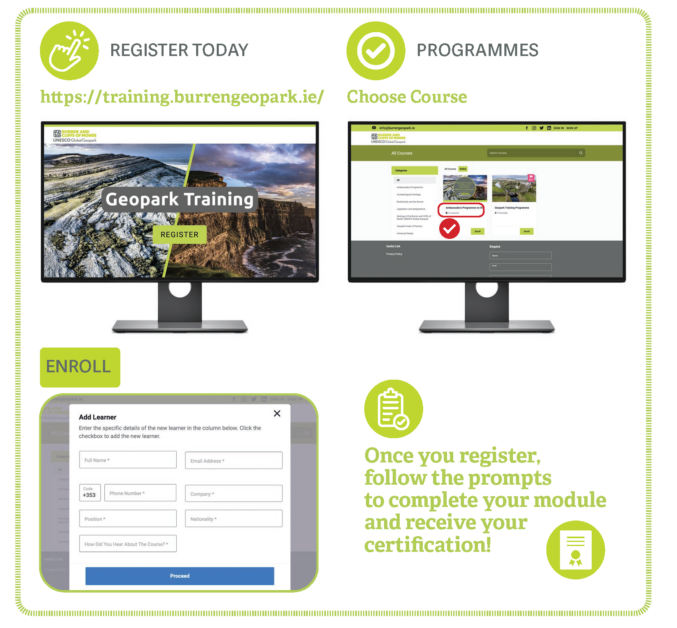 Once registered enroll in the Ambassadors program which features five separate modules focusing on UNESCO Global Geoparks, The Burren, the Cliffs of Moher, the Burren Ecotourism Network, and Leave No Trace, which promotes responsible outdoor recreation.