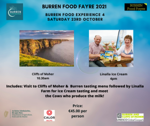 Some of the food experiences include an opportunity to take part in a diverse range of farm tours, including the Burren Farm Experience in Boston, Linnalla Ice Cream and dairy farm in New Quay and Caherconnell Fort and Sheepdog trials in the Burren, all highlighting the distinctive farming practices of the Burren region.