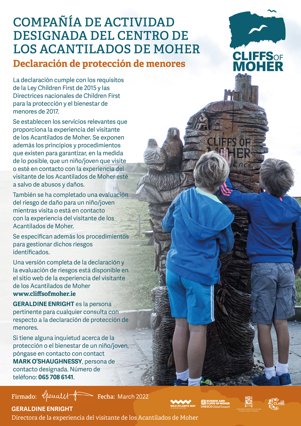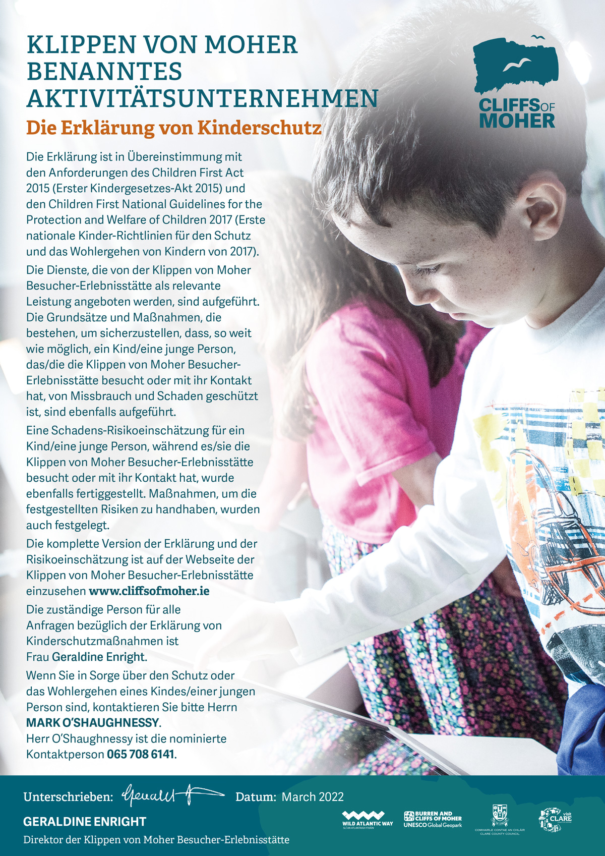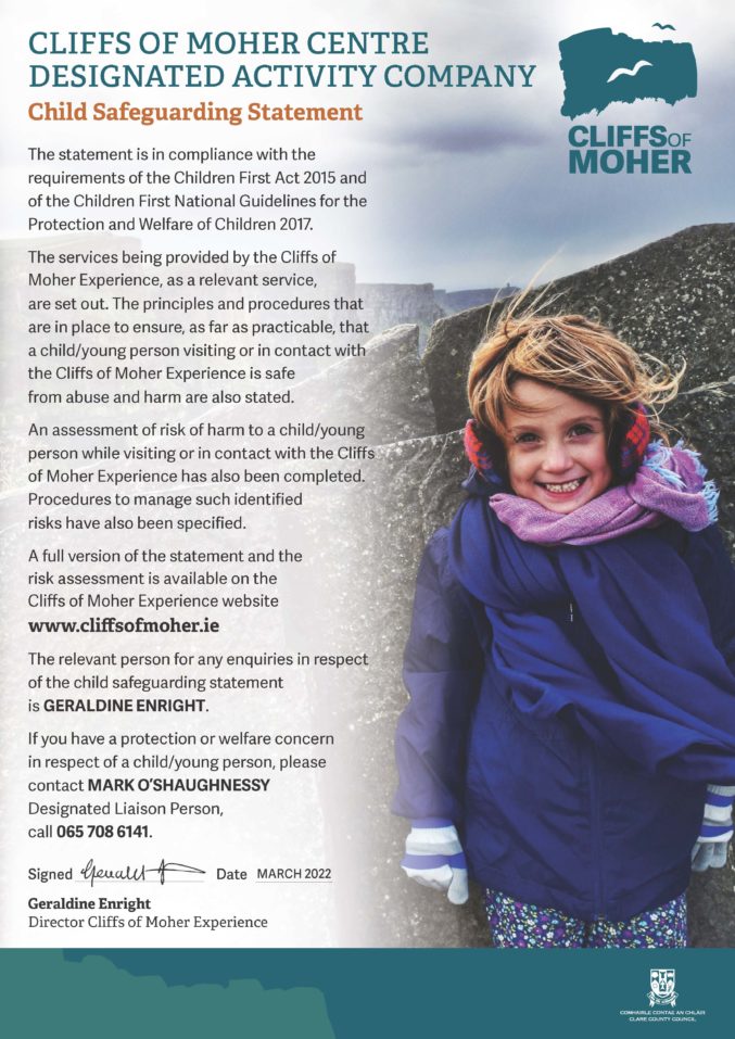 This Child Safeguarding Statement is in compliance with the requirements of the Children First Act 2015 and of Children First National Guidelines for the Protection and Welfare of Children 2017. The statement sets out the services being provided by the Cliffs of Moher Experience (COME) and the principles and procedures that are in place to ensure, as far as practicable, that a child/young person availing of, or in contact with, Cliffs of Moher Experience (COME) services is safe from abuse or harm. This statement includes an assessment of risk of “harm” to a child/young person while availing of or in contact with Cliffs of Moher and procedures to manage such risks are specified.