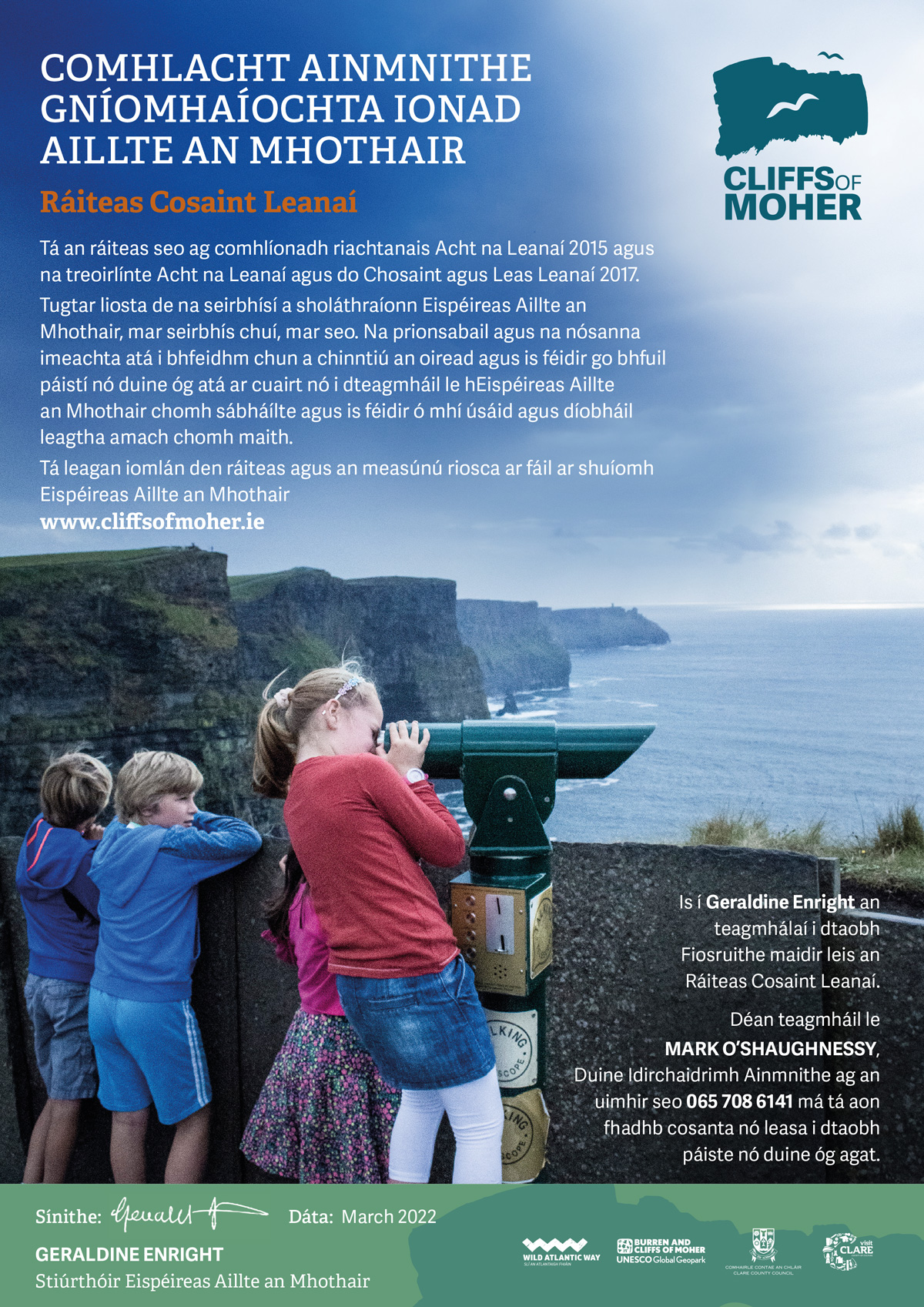 For the purpose and ease of the Child Safeguarding Statement all reference to the Cliffs of Moher Centre Designated Activity Company (COMC- DAC) and or the Cliffs of Moher (COM) where applicable will be refer to the Cliffs of Moher Experience (COME).