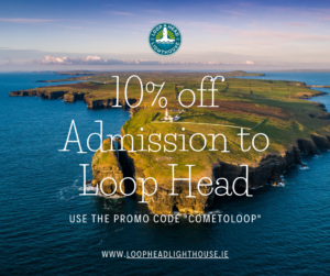 Panoramic views of dramatic rugged coastline, wild seas, and big sky await. Take a guided tour of the Lighthouse, climbing up the tower and going out onto the balcony. Weather permitting you will be able to see south as far as the Blasket Islands, and north to the Twelve Pins in Connemara, along the Wild Atlantic Way. The balcony is also the perfect vantage point from which to spot whales, dolphins, and seals, while the rock ledges and caves of the cliffs are home to many beautiful seabirds, including fulmars and kittiwakes.  If you wish to experience the Lighthouse, please avail of a special discount, using promo code COMETOLOOP on Loop Head Lighthouse website.
