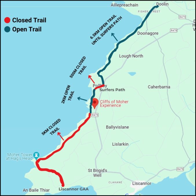 - Southern Section (Liscannor/Hags Head): 6KM from Liscannor is fully closed due to severe safety concerns.